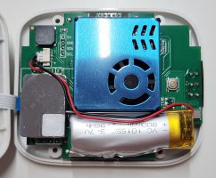 Can see the CO2 sensor, PM sensor and battery. The battery is 3.7V 800 mAh. It seems a bit bloated. Now that I can open up the unit, maybe I can find a replacement for it. I checked the fan was indeed dislodged by poking it with a micro screwdriver through the air vents.