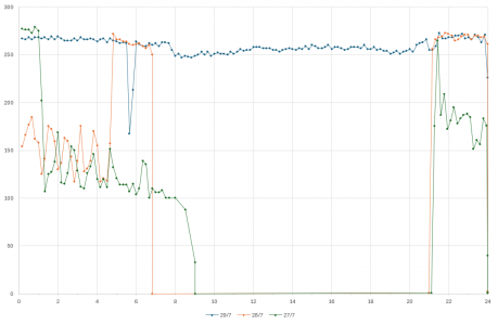 The orange line is the day it stopped working properly. From the chart, we can see it happened around 5 am.